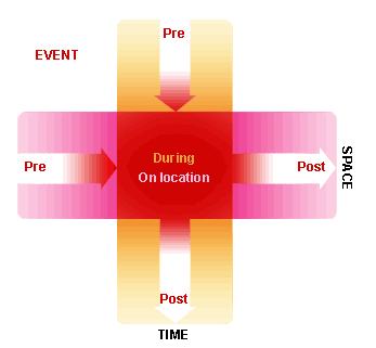 An event (I.E.: a date, going shopping together, a concert, a meeting in a cafe) is not confined to the physical time and space, but is rather a complex, fuzzy experiences that has a specific realization point with a collection of fuzziness around it . A great deal of communication is happening among the participants before, during and after the event; from the moment someone came up with the idea, through the scheduling, inviting and coordinating stages and until the moments of comparing and experiences long after it ended.